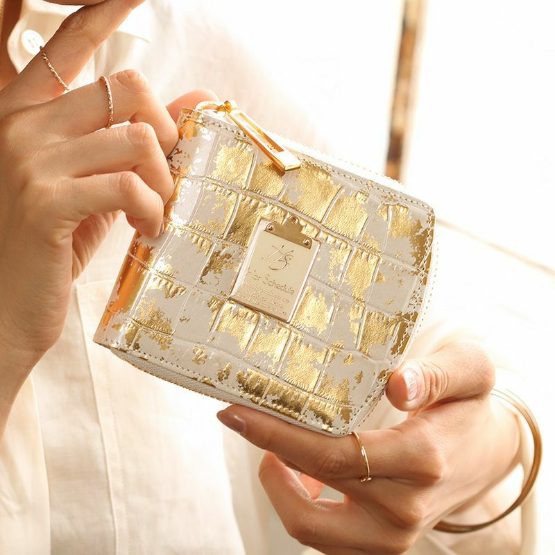 【HerSchedule】チェレットbillfold(二つ折りウォレット)シリーズ 輝く世界地図をイメージした箔のオリジナルレザー BrilliantWorld(ブリリアントワールド) 二つ折りラウンドファスナーウォレット (ハースケジュール)