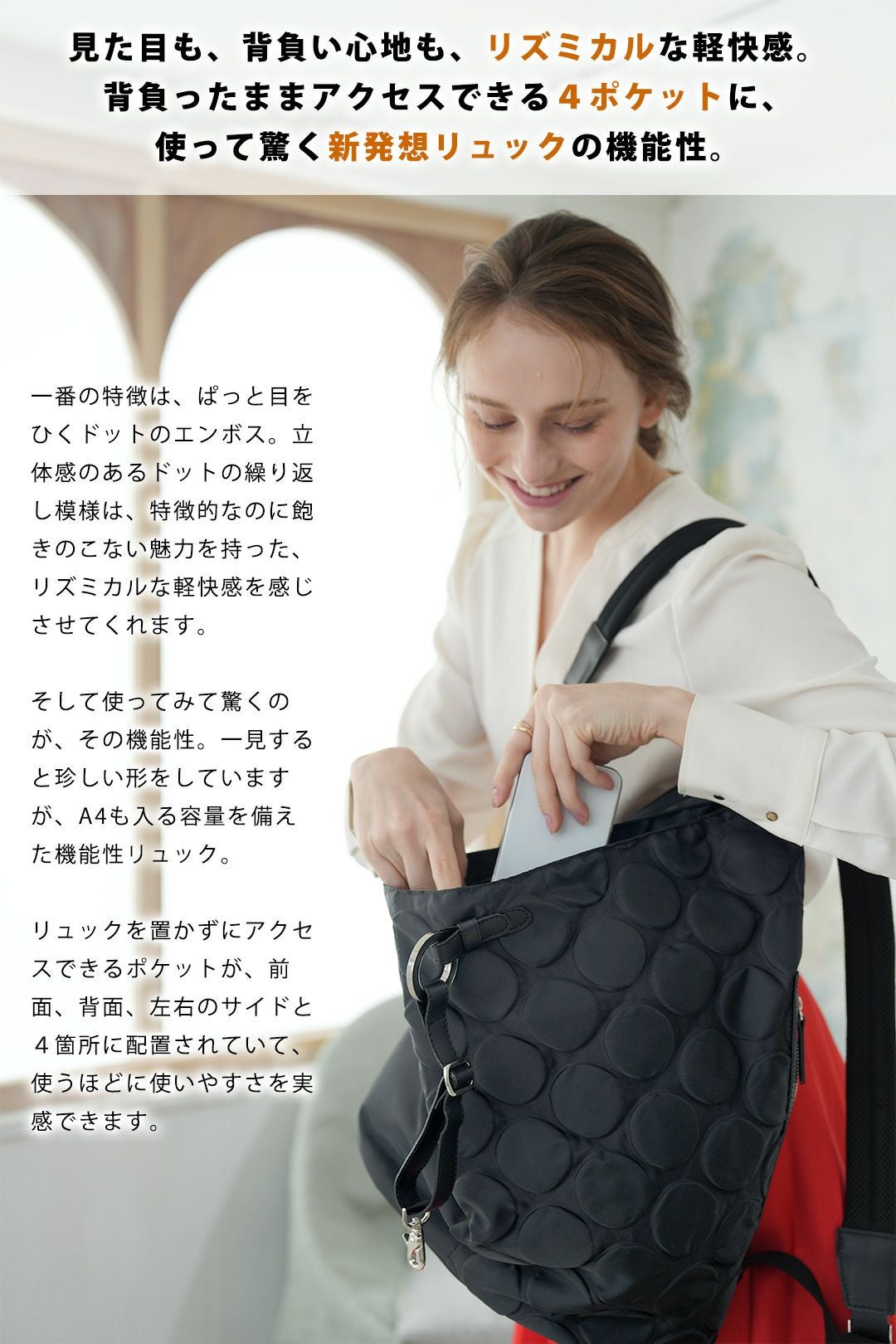 【cooga】後ろ姿が、主役になる。◆ドットが浮かび響あう、新発想のA4リュック|Pop Dot Pack(ポップドットパック)>>